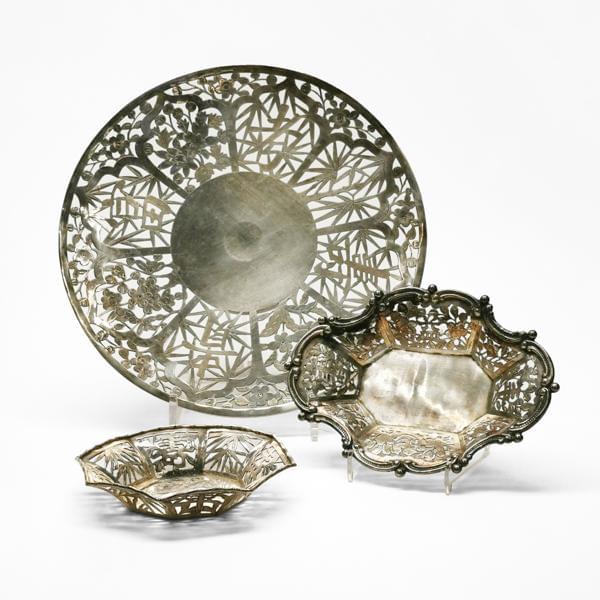 Argent à motif de caractères et bambou ajouré, D 14 cm à D 28 cm...