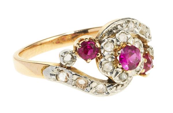 3108. *Bague ajourée sertie de trois rubis synthétiques entourés et re...