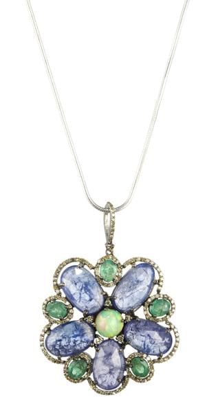 Centré d'une opale taille cabochon ronde entourée de tanzanites...