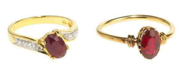 L'un serti d'une agate taille cabochon ovale entourée de rubis,...