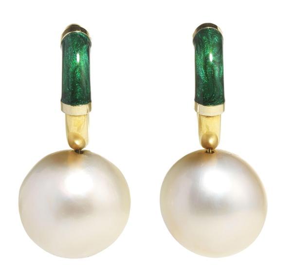 3170. Créoles émaillées vertes retenant chacune une perle Mabé