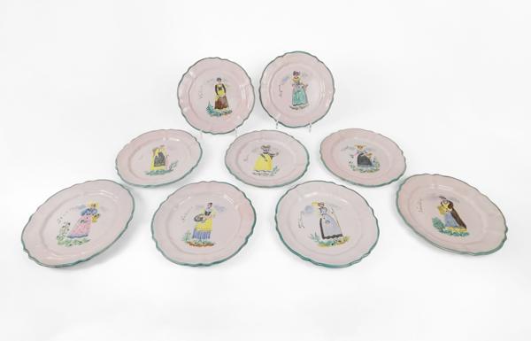 5214. Suite de 8 assiettes à décor de dames en costumes traditionnels...