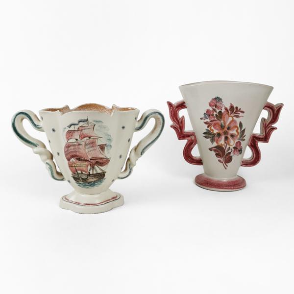 5215. Deux vases à anses volutes et décor de voilier et fleurs