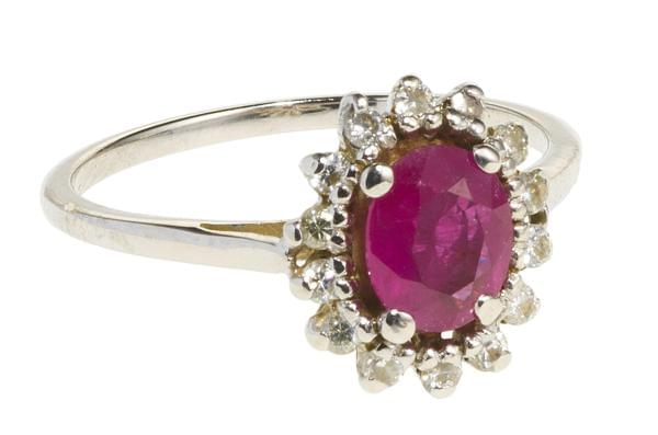 3222. *Bague fleur sertie d'un rubis birman (0,7 ct) entouré de diaman...