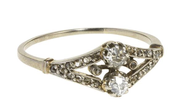 3228. *Bague losange ajourée sertie de deux diamants taille ancienne é...