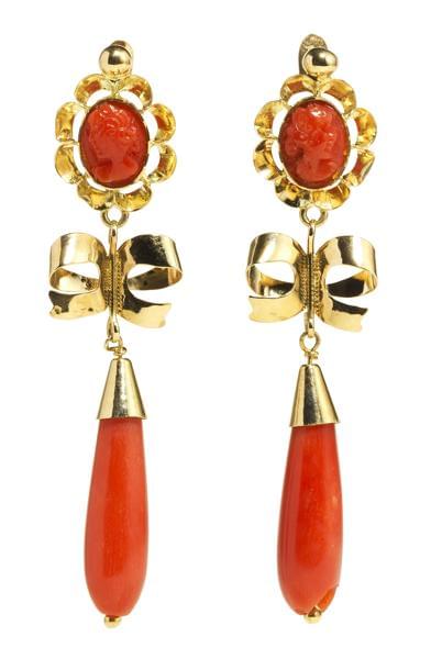 3235. *Pendants d'oreilles ornés d'un corail sculpté d'un buste et ret...