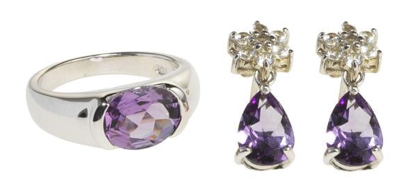 La bague sertie d'une améthyste taille ovale et les pendants for...