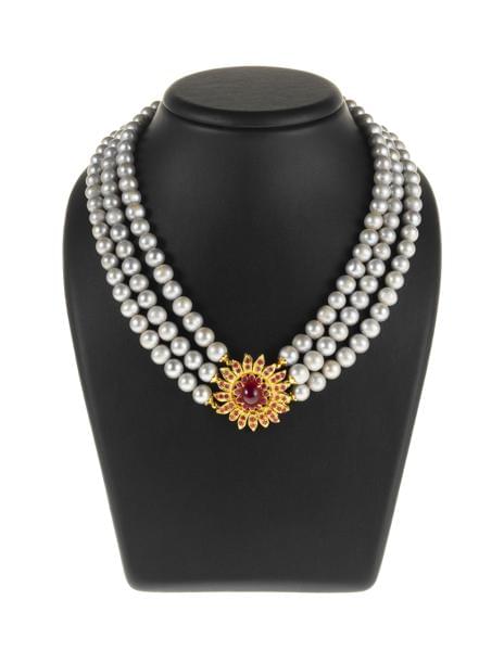 3253. *Collier trois rangs de perles grises centré d'un motif serti d'...