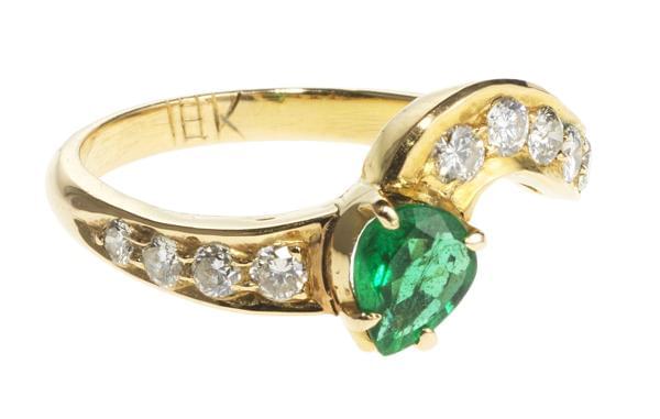 3263. Bague sertie d'une émeraude taille poire (env. 0,5 ct) épaulée d...