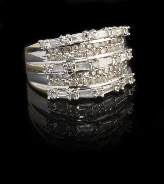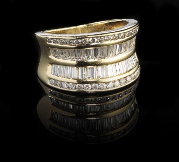 3268. Bague composée de trois lignes de diamants taille baguette et br...