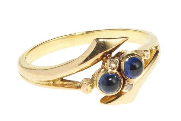 3433. Bague sertie de deux saphirs taille cabochon rehaussés de roses...
