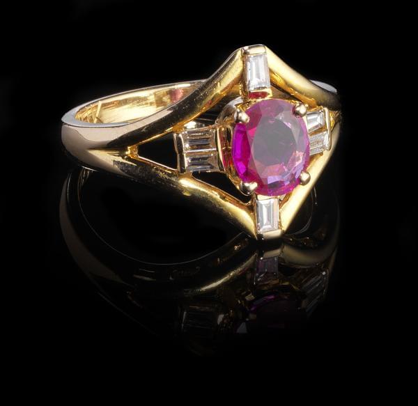 3420. *Bague sertie d'un rubis taille ovale du Siam (1,35 ct) épaulé d...