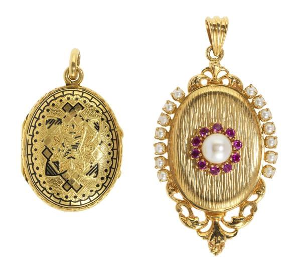 Retenant un médaillon émaillé noir pavé de rubis synthétiques et...