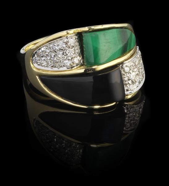3455. *Bague sertie d'un onyx et d'une malachite rehaussés de deux pav...