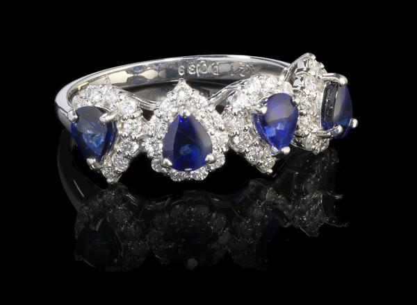 3456. *Bague composée d'une ligne de quatre motifs centrés de saphirs...