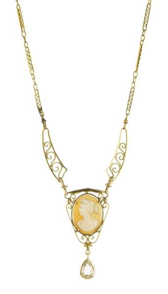 3466. *Collier à maille filigranée centré d'un camée retenant un diama...