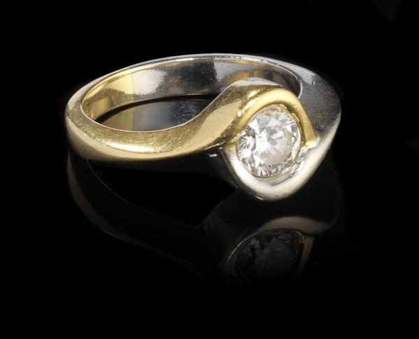 3474. Bague solitaire deux ors centrée d'un diamant (env. 0,6 ct)