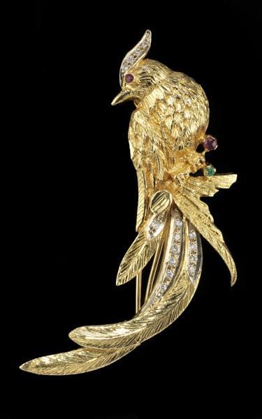 3478. Broche à motif de phénix serti de diamants, de rubis et d'une ém...