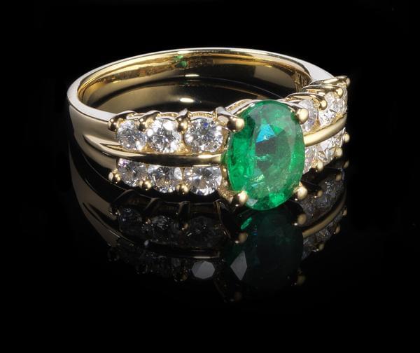 3480. Bague sertie d'une émeraude taille ovale (env. 1 ct) épaulée de...