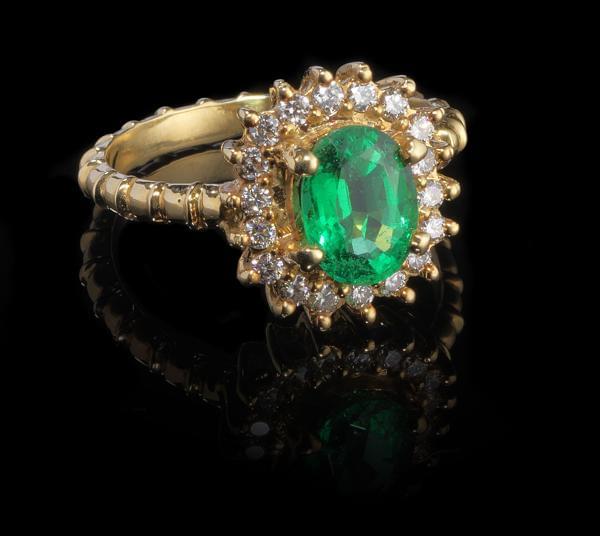 3481. Bague fleur centrée d'une émeraude taille ovale (1,15 ct) entour...