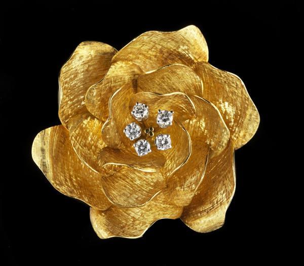 3482. Broche à motif de rose au cœur serti de diamants (env. 0,2 ct)