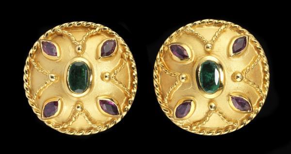 3489. Clips d'oreilles circulaires centrés d'une d'émeraude taille ova...