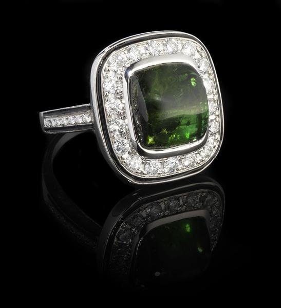 3492. *Bague centrée d'une tourmaline verte taille cabochon (5,94 ct)...