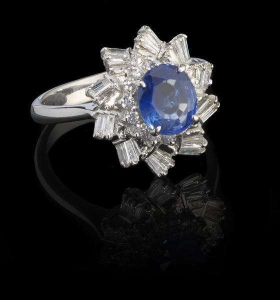 3493. *Bague fleur sertie d'un saphir du Sri Lanka taille ovale, Cornf...