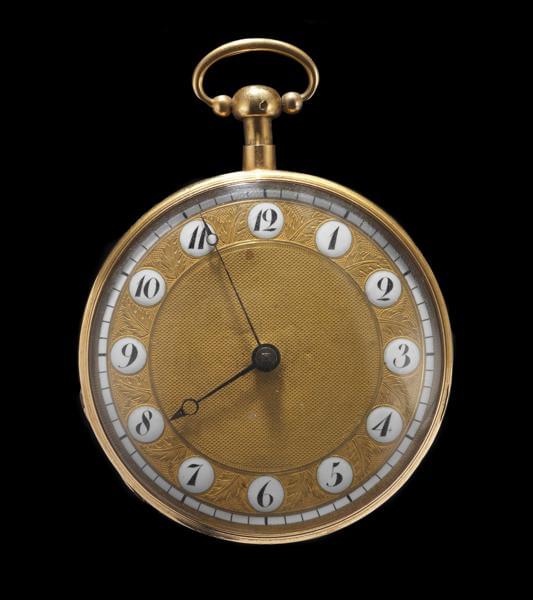 Cadran et aiguilles dorés, chiffres arabes noirs, secondes à 6h,...