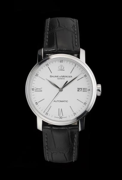 Cadran argenté, aiguilles et index bâtons noirs, date à guichet...
