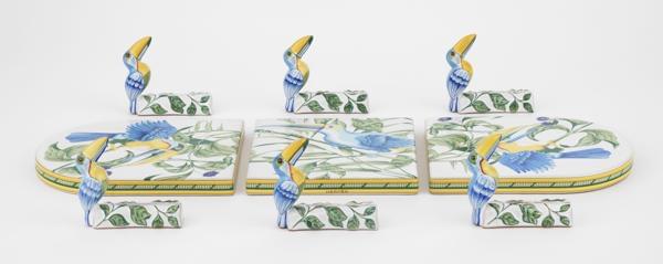 3691. Hermès, centre de table et six porte-menus à décor de toucans