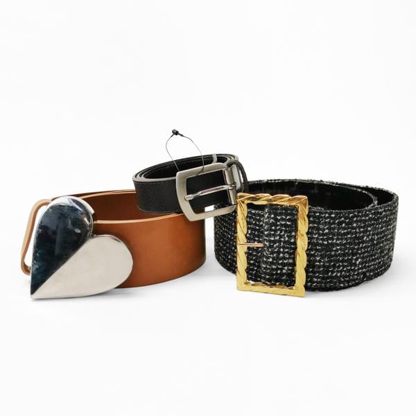 Lot de trois ceintures, cuir, tweed, métal doré et argenté, L 96...