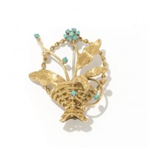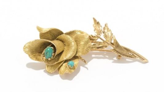 3205. Broche à motif de rose sertie de cabochons de turquoises