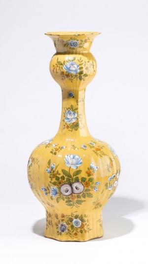 Faïence émaillée polychrome à décor de fleurs sur fond jaune, H...