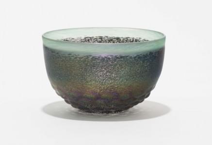 Vase boule à col pincé, verre translucide émaillé polychrome à d...