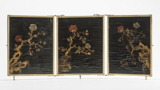 Laque de Chine à décor or sur fond noir de fleurs, miroirs sur l...