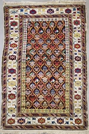 A décor de motifs stylisés polychromes sur fond noir, bordures s...