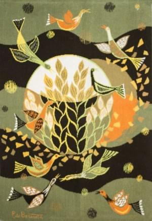 A motifs polychromes sur fond bleu ciel, laine, 179x297 cm