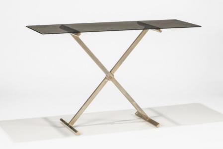 Piètement en X, verre fumé, métal, circa 1980, 85x140x49 cm