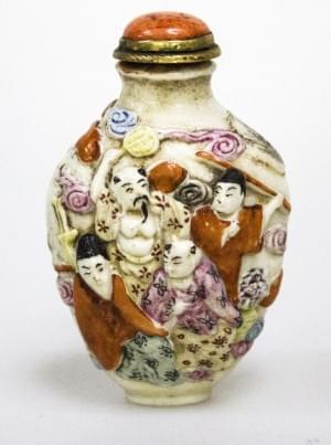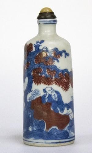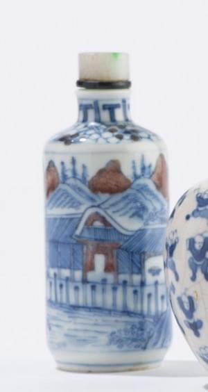A décor d'un village émaillé en bleu et rouge, bouchon en jade,...