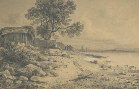 Paysage lacustre avec tour carrée, lavis d'encre signé, 17x27 cm