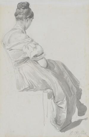 Femme de dos assise sur une chaise, lavis à l'encre noire sur pa...