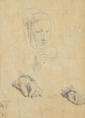 Etude d'une femme à la tasse et étude de main, encre sur calque...