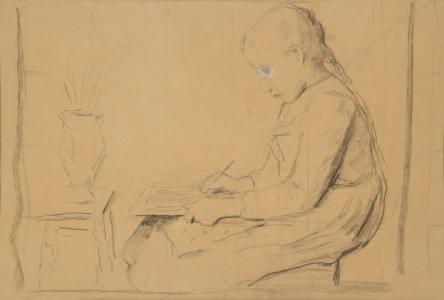 Jeune fille dessinant, fusain sur papier, 24x36 cm. Au dos, atte...