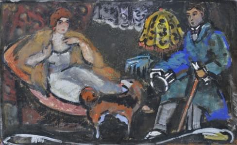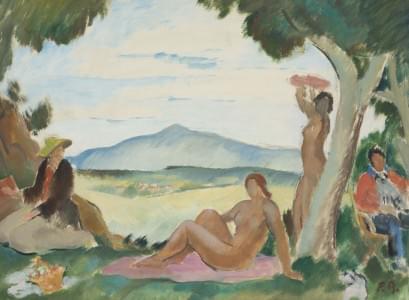 Lecture à la campagne, huile sur carton, non signée; 18x20cm.
