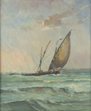 Retour de la pêche, huile sur toile, signée, 49x64 cm