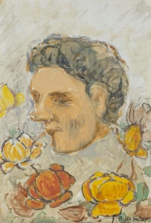 Portrait d'homme entouré de fleurs, huile sur carton signée, 38...