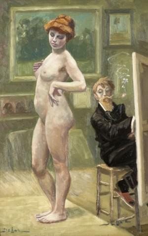 Modèle à l'atelier, huile sur panneau, signée, 38x25 cm