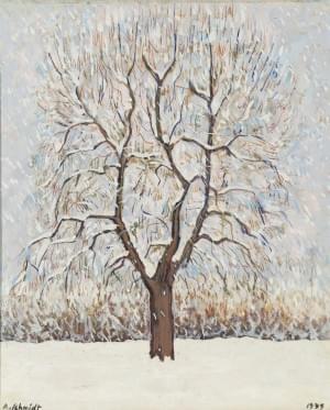 Il neige, huile sur pavatex, signée, datée 1939 et titrée au dos...
