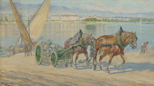 Chevaux de trait en rade de Genève, huile sur panneau, signée, 2...